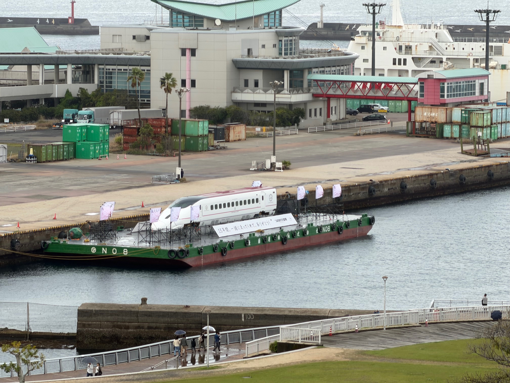 そのいつも見ている港の海上に船に乗った新幹線の姿が!